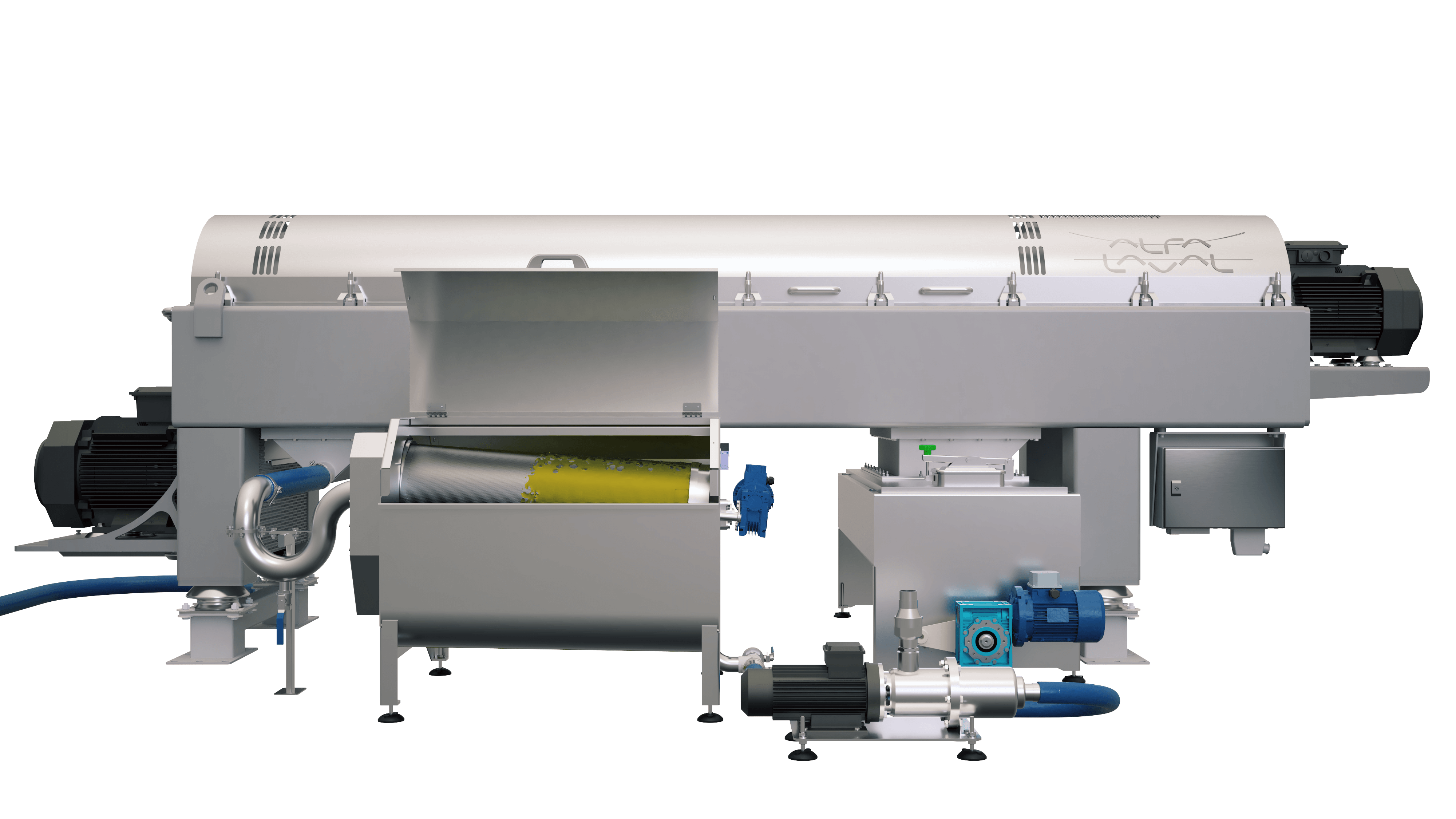 Het gepatenteerde, veerbelaste scharnierontwerp maakt het mogelijk om zelfs het zwaarste deksel met de hand te openen. Dit zorgt bovendien voor snelle en veilige toegang voor onderhoud en service van uw decantercentrifuge.